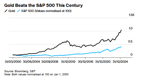 周五,金价一度上涨0.4%,达到每盎司3001.20美元。突破3000美元这一心理关口,凸显了黄金在动荡时期作为价值储存手段的悠久历史,同时也反映了市场中的恐慌情绪。过去25年间,金价上涨了10倍,甚至超越了同期上涨四倍的美国股市基准标普500指数。