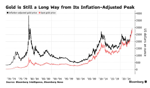 尽管金价上涨,但距离其经通胀调整后的历史峰值还有很长的路要走。1980年,金价达到了相当于每盎司3800美元的水平。当时,经济增长疲软、通胀失控以及地缘政治摩擦加剧共同推动了金价飙升。一些分析师认为,类似的力量将在2025年推动金价进一步进入未知领域。