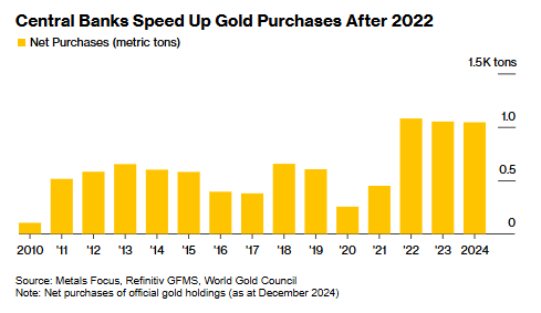 2022年俄乌冲突爆发后,许多俄罗斯在国外的美元资产被冻结。各大央行注意到:美元可能被用作武器,美国可以随意关闭它们进入金融系统的通道。自俄乌冲突爆发以来,央行的黄金购买量翻了一番,从每年约500吨增加到逾1000吨。