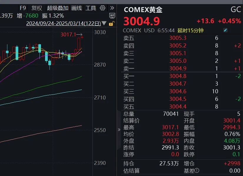 期货方面,COMEX黄金今日同样再创新高,截至记者发稿,盘中最高点触及3017.1美元/盎司。