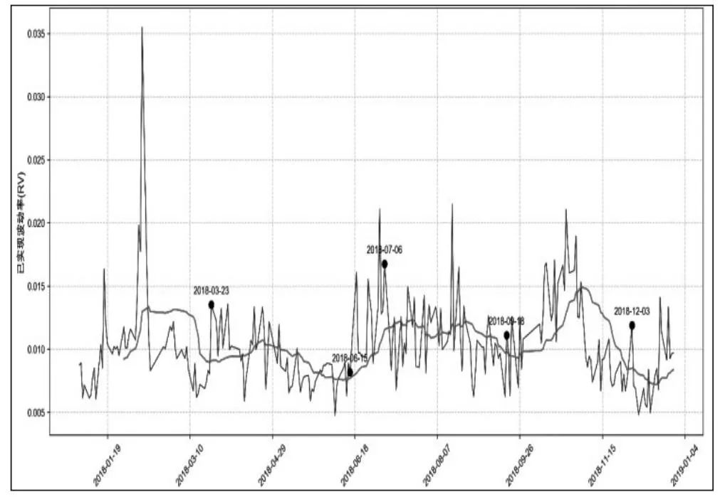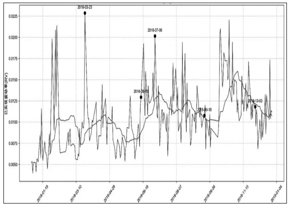 以下两张图分别展示了50ETF和500ETF在2018年的已实现波动率(RV)走势。由图示可清晰观察到: