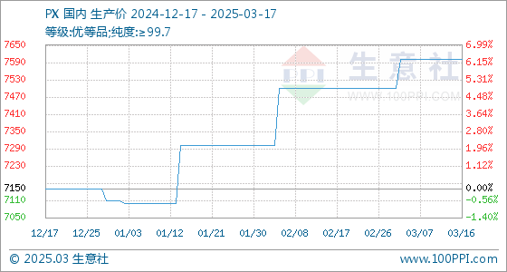 3月17日,生意社PX基准价为7600.00元/吨,与本月初(7500.00元/吨)相比,上涨了1.33%。