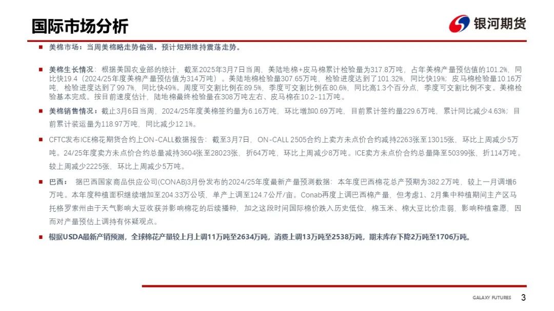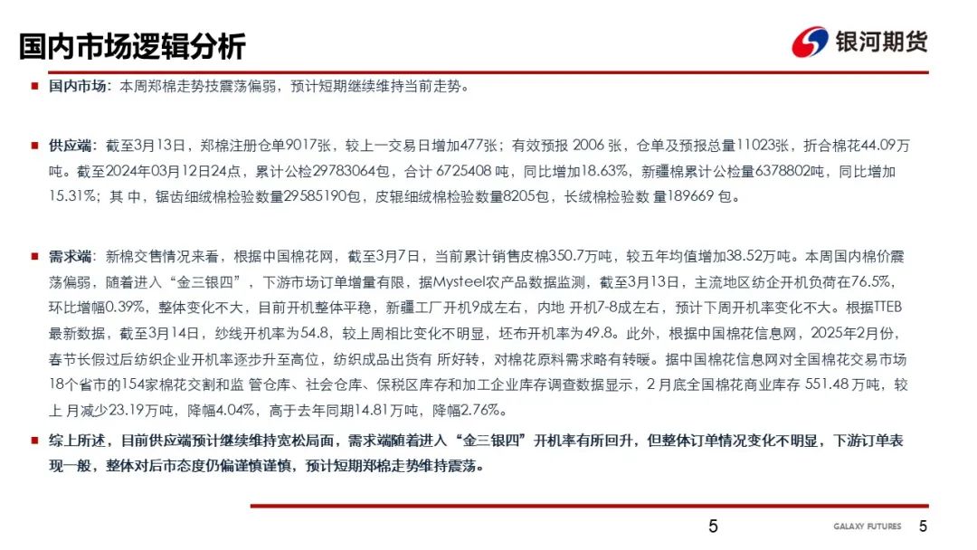 上周国际金融市场大幅震荡,美棉3月合约跌破了前期的76.5的支撑位,周跌幅约2.4%;国内郑棉期货全周跌幅约1.2%。