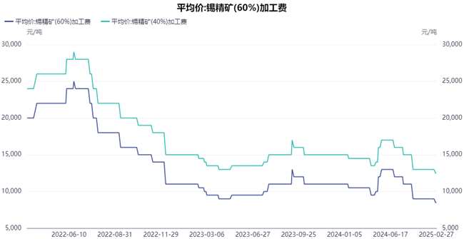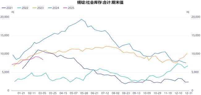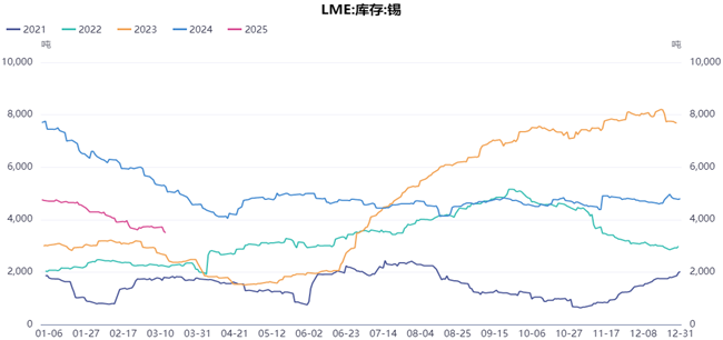 2025年全球锡矿产量预计为38万吨,若Bisie矿减少1.4万吨,缅甸仅增1万吨,供应缺口预计将从2024年的2万吨扩大至3.4万吨。锡市库存节后消耗速度较好,库存同比在相对低位,截至3月7日,国内锡锭社库为8876吨,LME锡库存仅3500吨,同比去年下降明显。