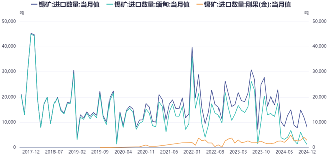 通知内容显示,Alphamin Resources公司宣布暂停其在刚果民主共和国(DRC)东部Bisie锡矿的采矿业务。这一决定源于刚果(金)北基伍省(North Kivu)局部冲突的升级,导致矿区安全形势恶化。Bisie是全球第三大锡矿,其主矿区Mpama North自2019年投产以来,年产能稳定在1.25万吨;2024年5月,Mpama South扩建项目投产,设计年产能提升至2万吨,但由于选厂调试延迟,实际产能释放滞后。2024年第三季度,Bisie矿锡产量环比增长22%至4917吨,得益于扩建项目逐步释放产能,但矿石品位从2024年一季度的3.83%降至第三季度的2.9%,回收率仅70%-73%,开采难度增加,呈现逐渐枯竭趋势。总的来说,2024年锡精矿产量达1.73万吨,占全球供应量的6%,若按照去年产量来算,今年如果持续停产,全年锡矿供应减量约1.4万金属吨。