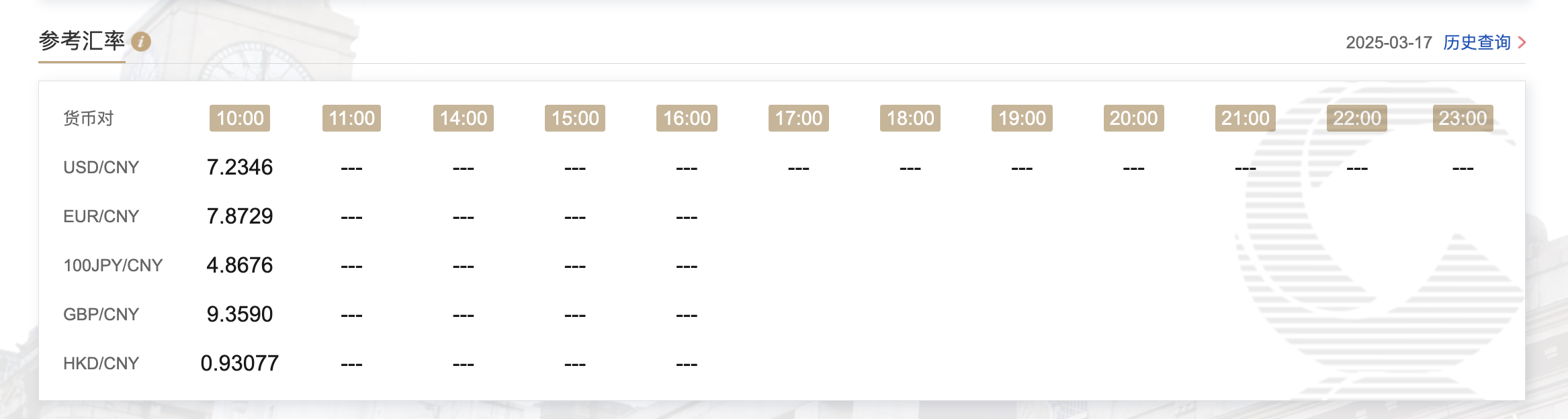 自2015年8月起,中国外汇交易中心根据市场需要,已发布人民币对美元、欧元、日元和英镑等四个交易货币对的时点参考汇率,综合反映当日境内外汇市场供求状况。