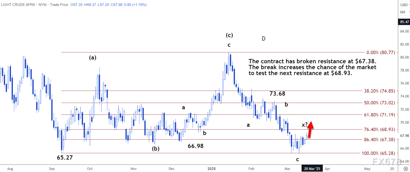 日线图上,该合约已突破阻力位 67.38 美元。突破该阻力位增加了市场测试下一阻力位 68.93 美元的机会。