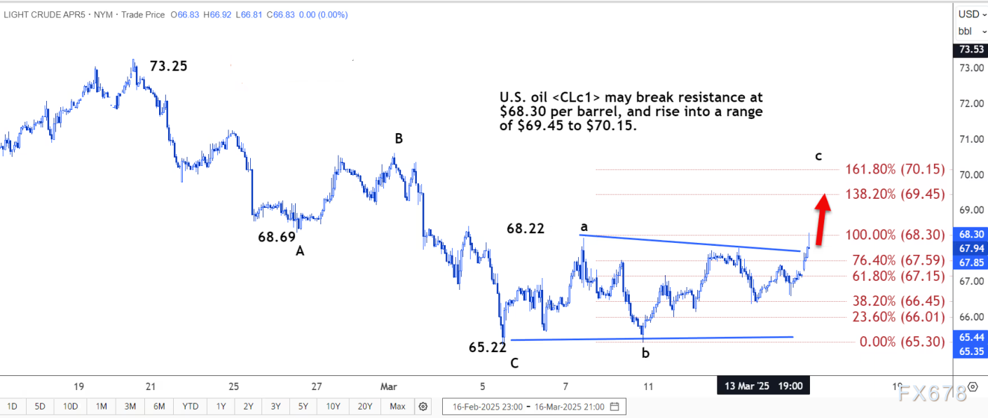 路透技术分析师周一指出,美国原油可能突破每桶 68.30 美元的阻力位,升至 69.45 美元至 70.15 美元的区间。