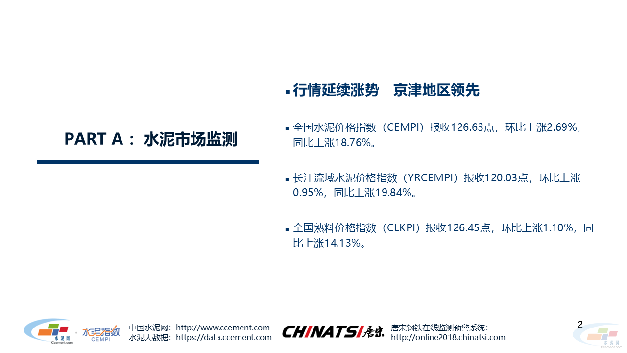 全国水泥价格指数(CEMPI)报收126.63点,环比上涨2.69%,同比上涨18.76%。长江流域水泥价格指数(YRCEMPI)报收120.03点,环比上涨0.95%,同比上涨19.84%。全国熟料价格指数(CLKPI)报收126.45点,环比上涨1.10%,同比上涨14.13%。