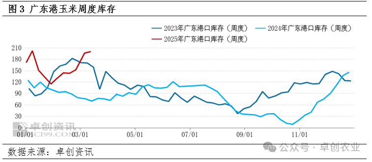 3月中上旬,除了北港到货成本与心态的变动,东南沿海地区库存压力对价格的抑制持续存在。上旬由于心态与成本均利多价格,供应压力的影响被弱化,虽然下游企业依旧多维持零星补库,但贸易环节报价偏强,除质量偏差货源外议价空间有限,南北贸易利差仅维持窄幅倒挂水平。但本月中旬开始,由于市场心态松动,库存压力对价格的影响再度体现,贸易环节报价虽然调整幅度不大,但市场实际成交议价空间提升,市场成交价格重心回落,南北贸易倒挂幅度提高。截止3月13日,广东港(粤东港区)作为南方港口的代表,玉米库存约199.7万吨,其中内贸库存占比超过95%,从图3中可以看出其远高于往年同期水平,持续高位库存不仅是对供需关系的压力也是对质量稳定性的考验,并且将会是未来一段时间内需要持续关注的影响因素。