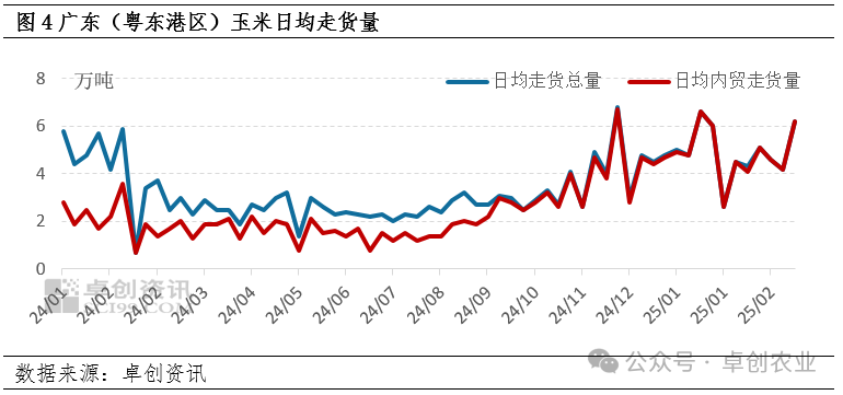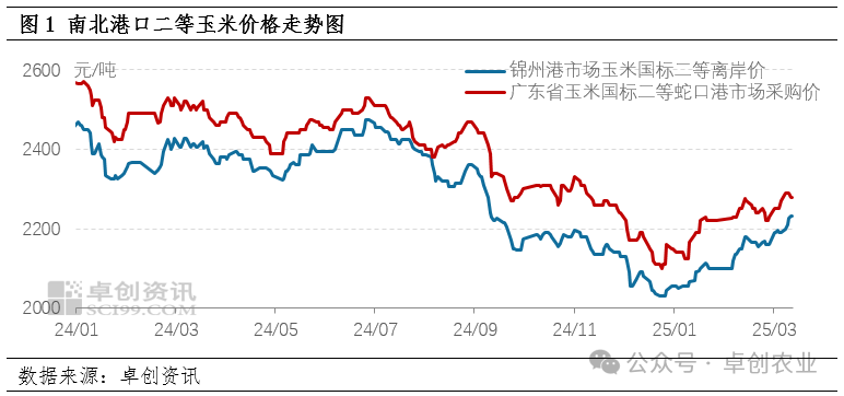 2025年3月上旬由于产区深加工企业维持较高采购积极性,叠加基层节后售粮进度较快以及部分贸易商建仓,东北产区预期的基层节后卖压并未有显著表现,在深加工企业频繁提价促收的情况下,东北产区基层玉米价格持续走高。受此影响,期货盘面在3月上旬依旧保持相对高位升水现货状态,北港商家收购积极性提升,收购价格上涨,导致南港到货成本同步上涨,并且对南港贸易心态呈现利多表现。