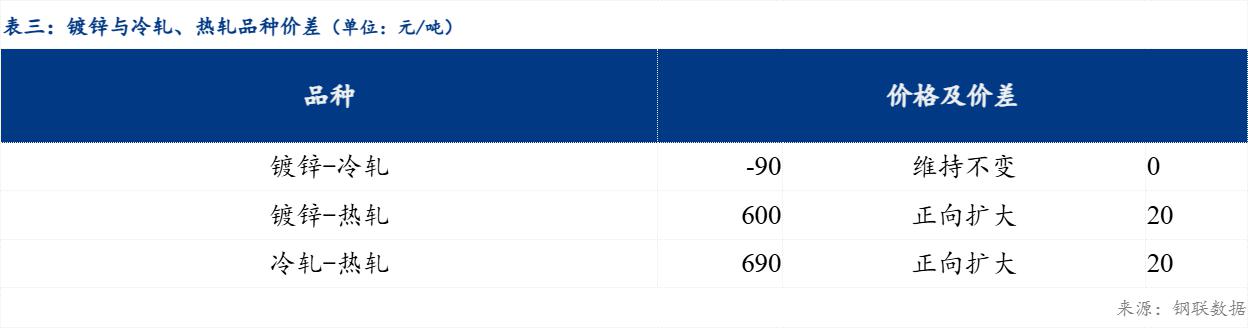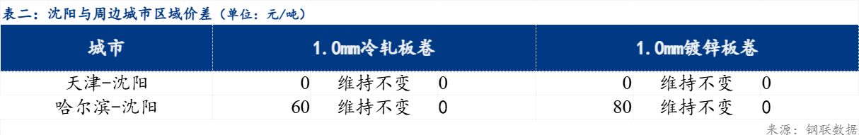 区域价差来看,天津-沈阳冷轧板卷区域价差维持不变,沈阳-哈尔滨冷轧板卷区域价差维持不变;天津-沈阳镀锌板卷区域价差维持不变,沈阳-哈尔滨镀锌板卷区域价差维持不变。品种价差来看,镀冷品种价差维持不变 ;镀热品种价差扩大20元/吨;冷热品种价差扩大20元/吨。