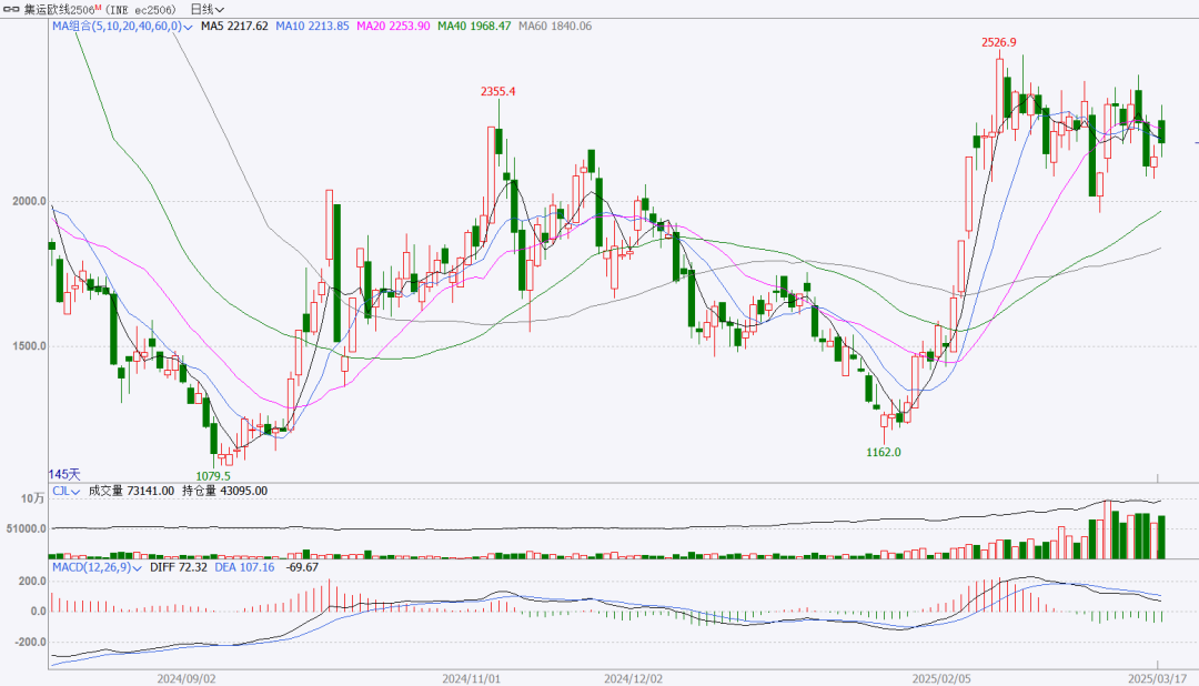 地缘局势再度升温,为期市带来利多情绪扰动,今日集运多合约走势偏强,其中主力EC2506合约收于2204.1点,涨幅为3.41%。