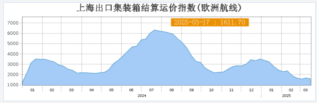 (1)现货指数方面,上周五公布的SCFI一欧洲线运价指数为1342美元/TEU,环比跌幅扩大至15.2%,表明3月即期运价还在持续走弱,对04合约利空效果明显。今日盘后最新公布SCFIS:欧洲航线运价指数为1611.70点,环比减少3.9%,目前标的现货指数较主力合约贴水较深,或对期价走势构成一定压力。