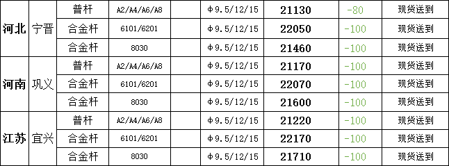 3月17日宁晋市场普铝杆现货报盘价21130元/吨,较上一交易日报价跌80元/吨;巩义市场普铝杆现货报盘价21170元/吨,较上一交易日报价跌100元/吨;宜兴市场普铝杆报盘价21220元/吨,较上一交易日报价跌100元/吨。