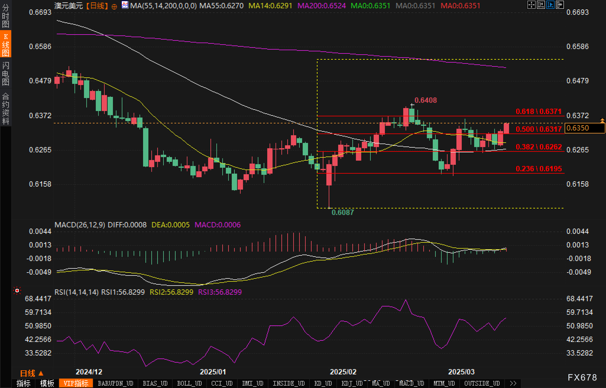 支撑方面:短期支撑位落在通道下轨以及前期水平位0.6322附近,若跌破,进一步支撑或看向0.6270-0.6262区间(其中0.6262是斐波那契38.2%回调位)。