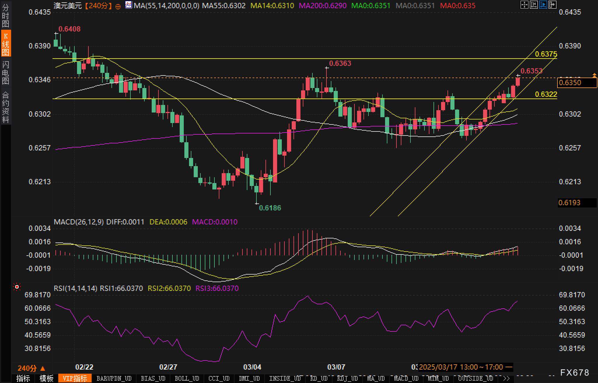 阻力方面:上方可关注前期高点0.6363与更高位置的0.6375,若能突破上述水平,则有机会冲击0.6408一线;