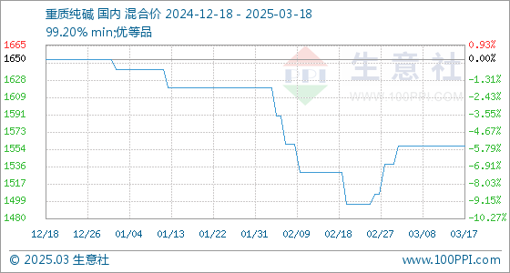 3月18日,生意社重质纯碱基准价为1558.00元/吨,与本月初(1538.00元/吨)相比,上涨了1.30%。