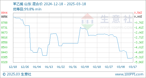 3月18日生意社苯乙烯基准价为8386.00元/吨