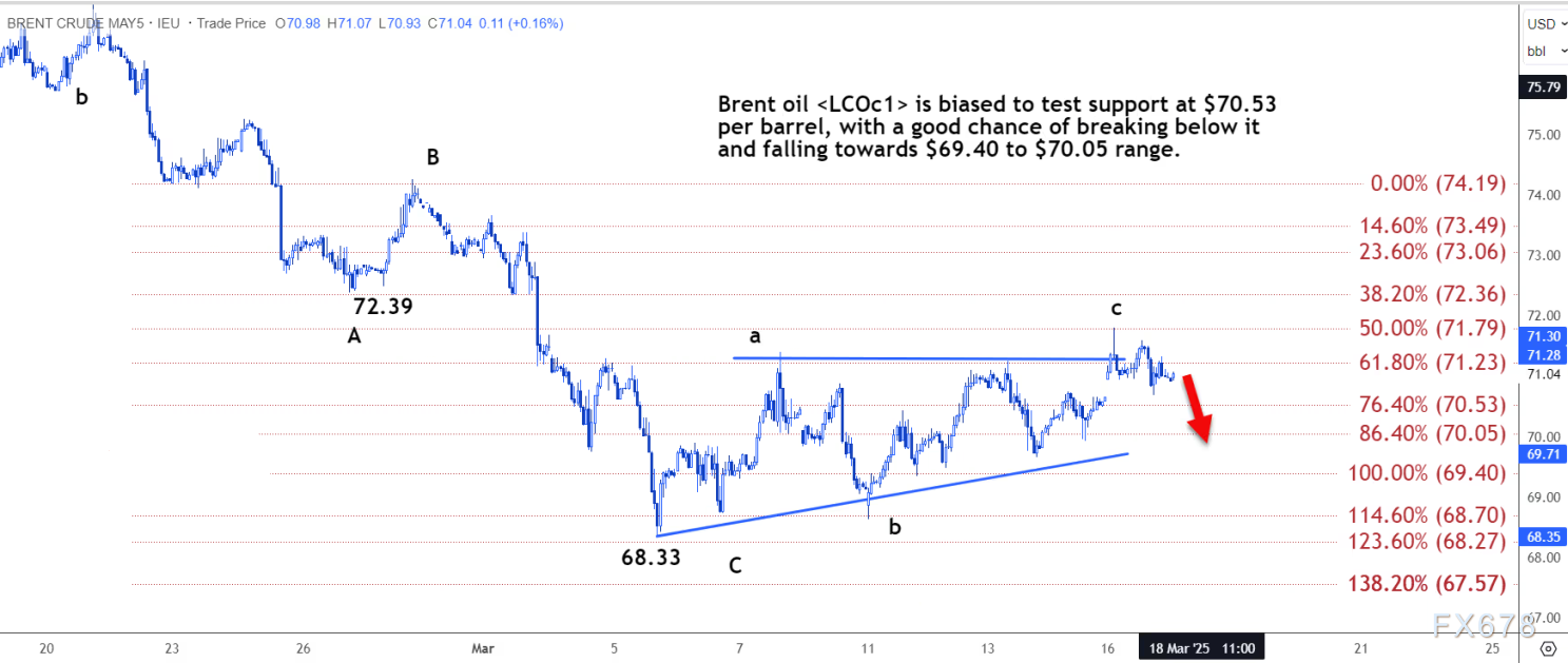 路透技术分析师周二指出,布伦特原油倾向于测试每桶 70.53 美元的支撑位,很有可能跌破该水平并跌向69.40美元至70.05美元的区间。