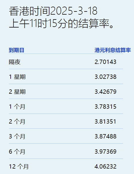 3月18日,港元拆息普遍微升,其中,隔夜息升8基点至2.70143%,见近一周最高,而与楼按相关的一个月拆息亦升至3.78315%。反映银行资金成本的三个月拆息两连升,报3.87488%。六个月及一年期分别升至3.97369%和4.06232%。