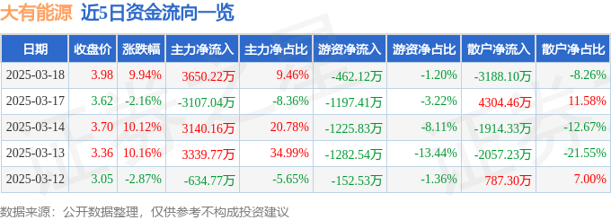 证券之星消息,大有能源3月18日涨停收盘,收盘价3.98元。该股于10点34分涨停,2次打开涨停,截止收盘封单资金为815.38万元,占其流通市值0.09%。