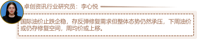 卓创资讯研究员李心悦:国际油价止跌企稳,存反弹修复需求但整体态势仍然承压,下周油价或仍存修复空间,周均价或上移。