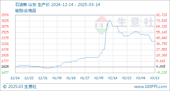 3月14日,生意社石油焦基准价为2302.75元/吨,与本月初(2545.00元/吨)相比,下降了-9.52%。