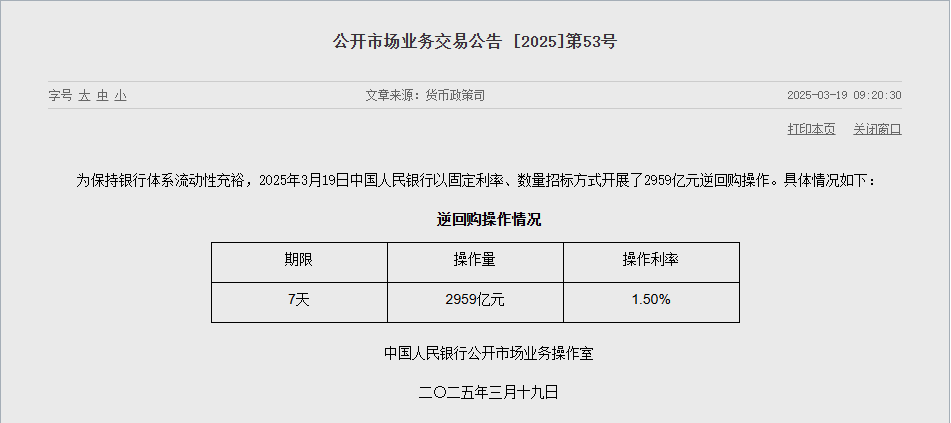 2025年3月19日中国人民银行以固定利率、数量招标方式开展了2959亿元逆回购操作,中标利率为1.50%。