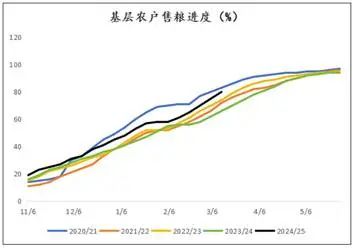 总体来看,本年度我国玉米供应预估低于上一年度,供应端压力不大。从供应释放情况来看,基层农户售粮进入尾声。钢联农产品数据显示,截至3月13日,基层农户玉米售粮进度为80%,同比偏快10%。也就是说,供应高峰或已过去,整体呈现压力逐步减轻的态势。