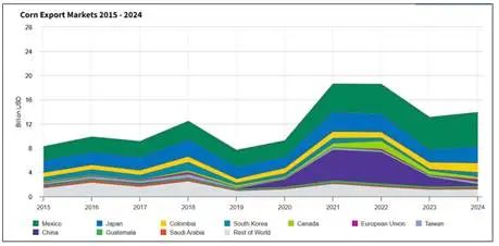 美国玉米的主要出口国有墨西哥、日本、哥伦比亚、韩国、加拿大、欧盟、中国等国家和地区,这几个国家和地区在美玉米出口市场的占比超过60%。今年以来,美国贸易政策不稳定性非常强,并且涉及到美玉米主要出口国中的多个国家。
