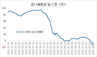 需要特别注意的是,彼时代表铜精矿加工费的SMM进口铜精矿指数还在15.29美元/吨(截至2024年3月8日),而截至2025年3月7日,该指数已经跌至-15.83美元/吨。