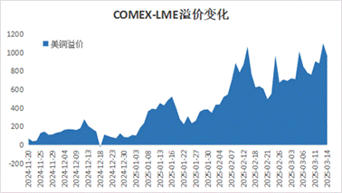 受美国政府的关税政策和美国铜库存水平偏低的双重影响,自今年1月份以来,COMEX期铜相较伦敦3个月期铜的价格从去年12月份的不足每吨100美元快速上涨,在2月中旬突破了每吨1000美元大关。至3月中旬,COMEX-LME的溢价仍维持在每吨800至1000美元的历史高位(看下图)。