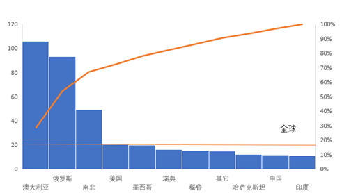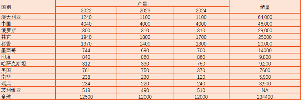 图1:锌矿产量及储量:按国家分类 单位:千吨
