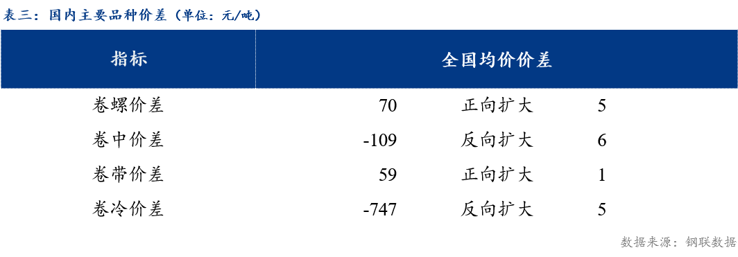 从品种价差来看,卷螺差较上一交易日正向扩大5元/吨,热中价差较上一交易日反向扩大6元/吨,热带价差较上一交易日正向扩大1元/吨,热冷价差较上一交易日反向扩大5元/吨 。