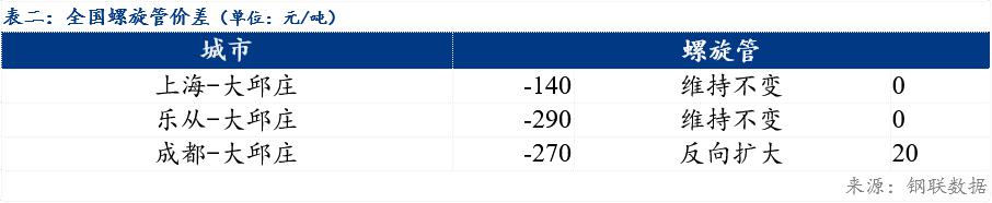 今日螺旋管南北价差较上一交易日小幅波动,华东区域与华北区域价差为-140元/吨,华南与华北价差为-290元/吨,西南与华北价差为-270元/吨。