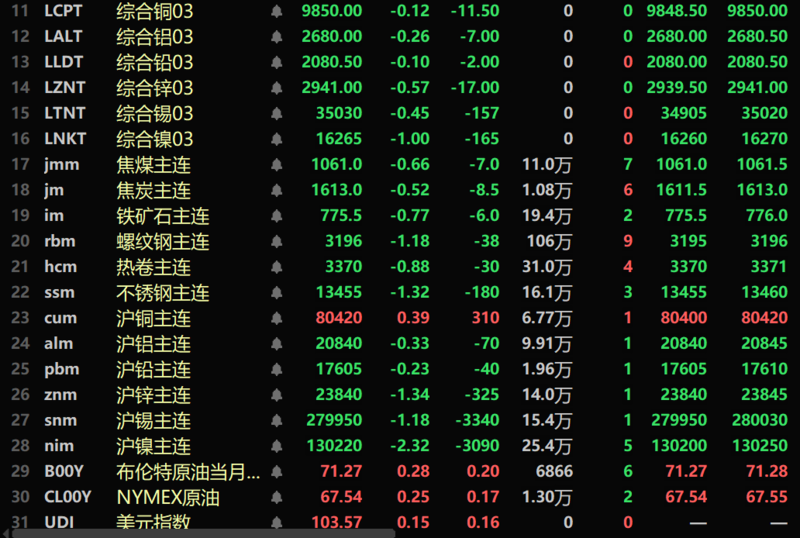 黑色系均飘绿,铁矿跌0.77%,螺纹、热卷分别跌1.18%、0.88%,不锈钢跌1.32%。双焦方面,焦煤跌0.66%,焦炭跌0.52%。