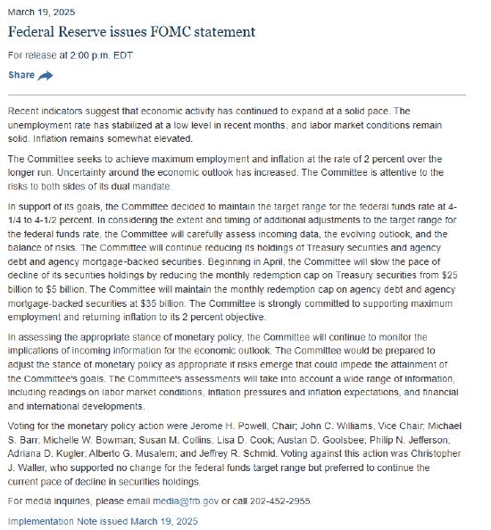 北京时间3月20日凌晨2:30,美联储在联储的货币政策委员会FOMC会后宣布,联邦基金利率的目标区间继续保持在4.25%至4.5%不变。