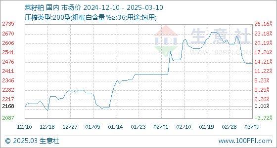 3月10日,生意社菜籽粕基准价为2466.67元/吨,与本月初(2601.67元/吨)相比,下降了-5.19%。