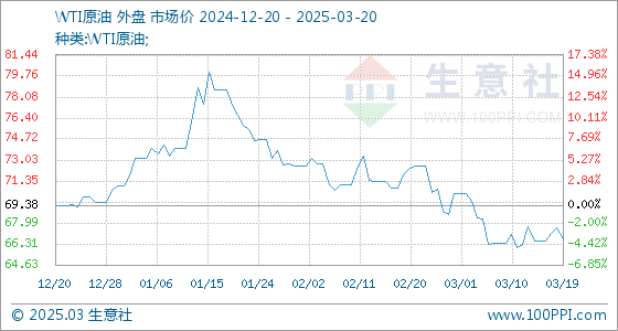 3月20日,生意社WTI原油基准价为66.75美元/桶,与本月初(70.35美元/桶)相比,下降了-5.12%。