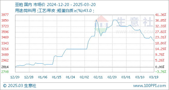 3月20日,生意社豆粕基准价为3402.00元/吨,与本月初(3722.00元/吨)相比,下降了-8.60%。