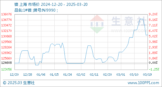 3月20日,生意社镍基准价为131241.67元/吨,与本月初(127216.67元/吨)相比,上涨了3.16%。
