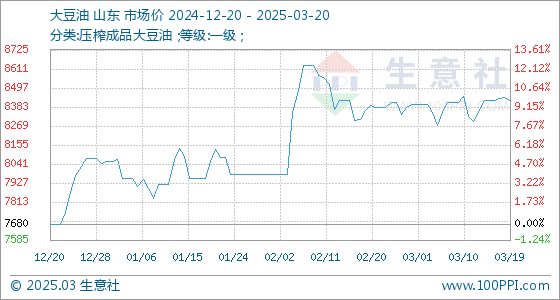 3月20日,生意社大豆油基准价为8422.00元/吨,与本月初(8400.00元/吨)相比,上涨了0.26%。