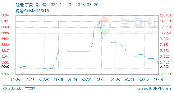 3月20日,生意社锰硅基准价为5960.00元/吨,与本月初(6180.00元/吨)相比,下降了-3.56%。