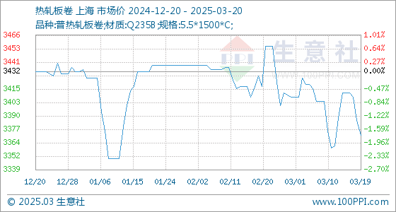 3月20日,生意社热轧板卷基准价为3372.00元/吨,与本月初(3408.00元/吨)相比,下降了-1.06%。