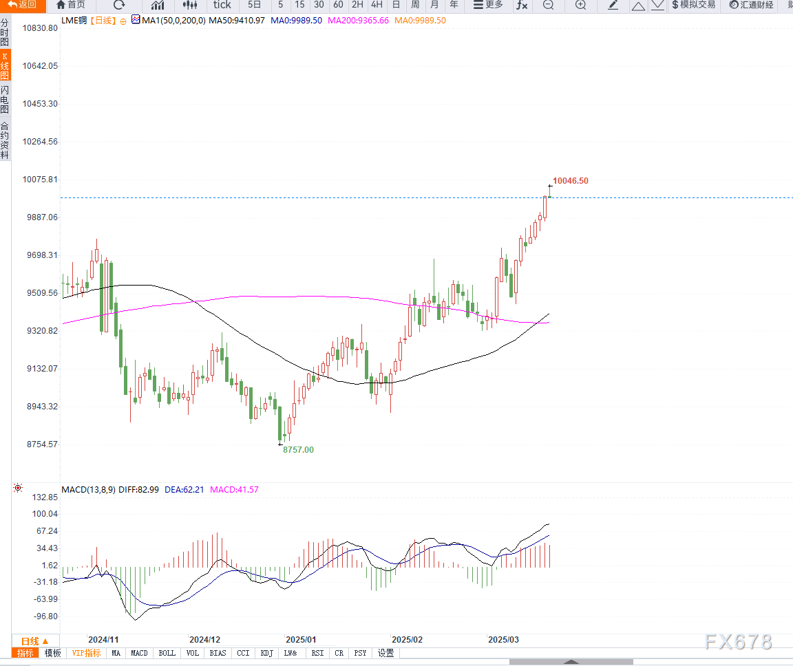 美元因此在周四早盘走弱,美元指数稳定在103.41,接近五个月低点。同期,特朗普推动的贸易担忧情绪加剧,导致铜价突破关键关口1万美元/吨,反映市场对供应短缺的强烈预期。