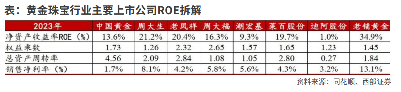 渠道驱动型的企业,如老凤祥、周大生、中国黄金等,周转率都非常高,ROE(净资产收益率)也很高。
