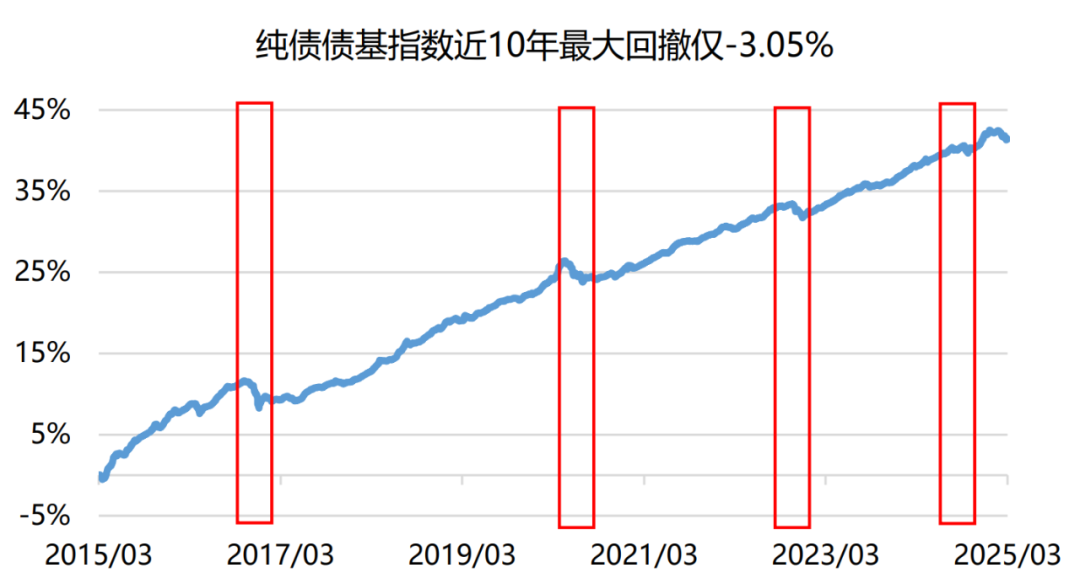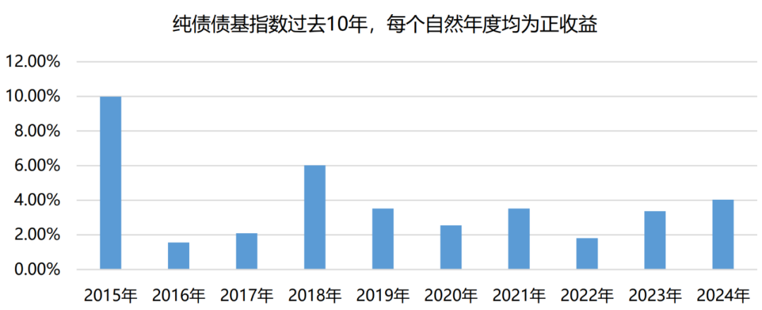 但从历史数据来看,债券类资产低波属性依然突出:以纯债债基指数观察,调整周期相对较短,曲线在小幅震荡中上行;过去10年每个自然年度均获正收益,最大回撤仅-3.05%。纯债债基依然具备较好的中长期配置价值。
