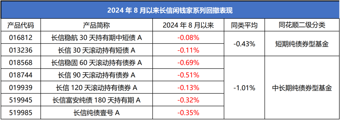 以此轮债市调整为例,综合考虑2024年8月~10月的震荡,长信“闲钱家”系列下,不同久期、持有期定位的纯债债基均有超出同类的回撤表现:
