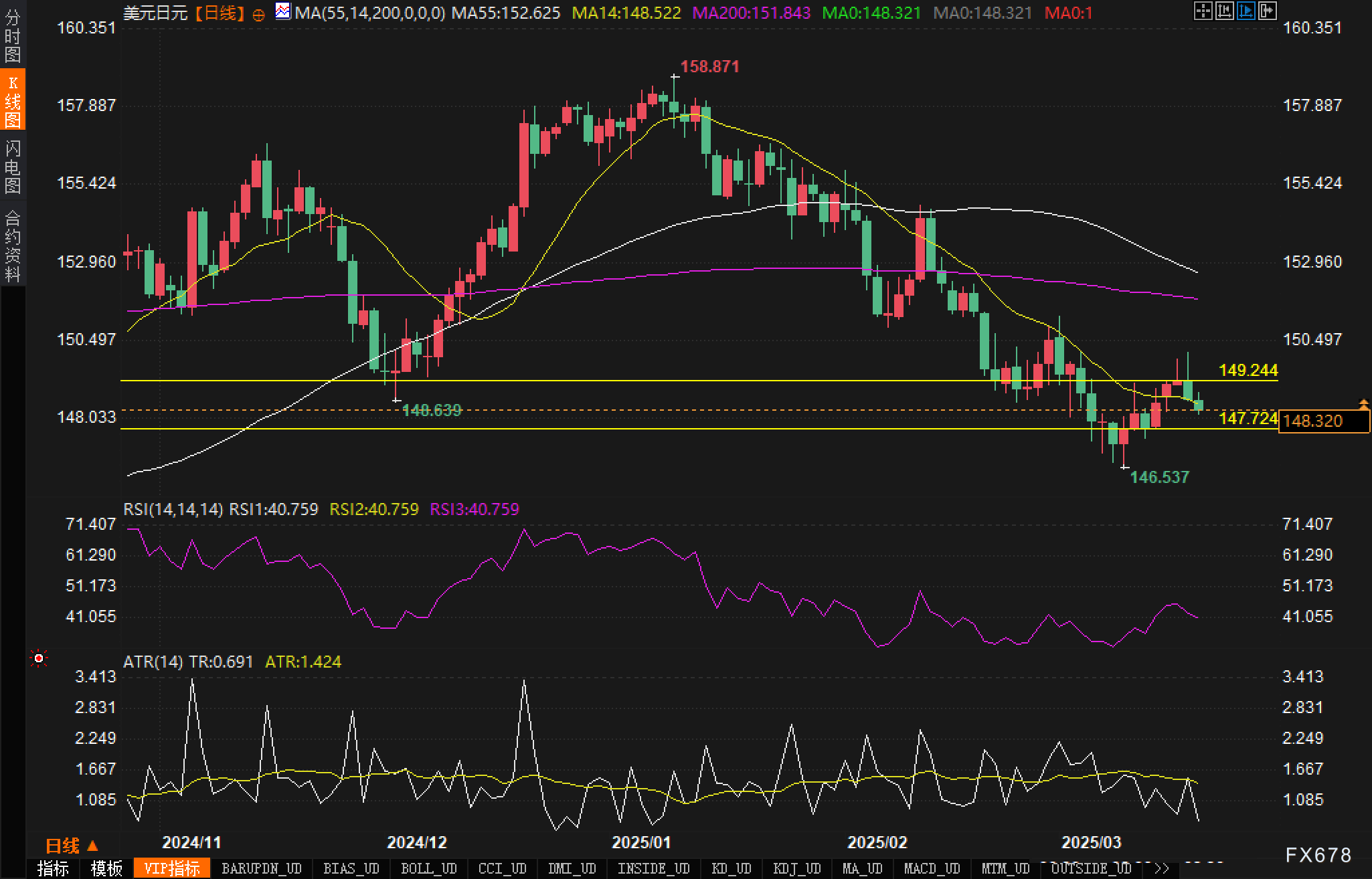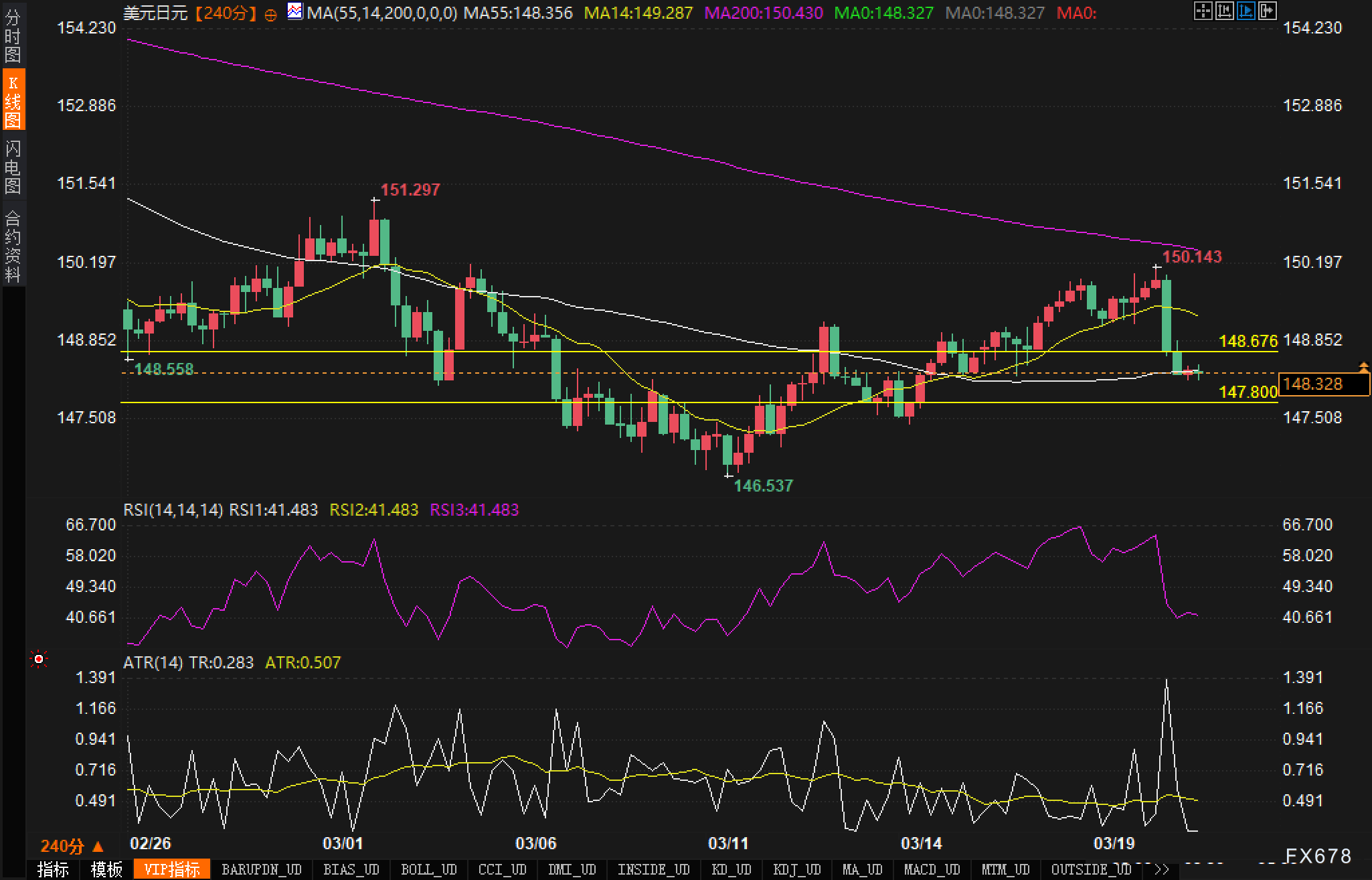 在4小时图上(MA55=148.356、MA14=149.287、MA200=150.430),短期均线与长期均线开始靠近,但价格重心仍略偏下方。近期高点150.143与低点146.537构成震荡区间,当前价格则位于中部区域附近。RSI(14)在41左右,显示短线动能略微偏空。ATR(14)则在0.283~0.507区间浮动,波动率虽然不高,但在地缘风险驱动下,随时可能出现新的突破走势。若价格反抽至148.676-149.287区间仍遭遇抛压,需警惕汇价再度下探148.00以及147.800等关键位置。